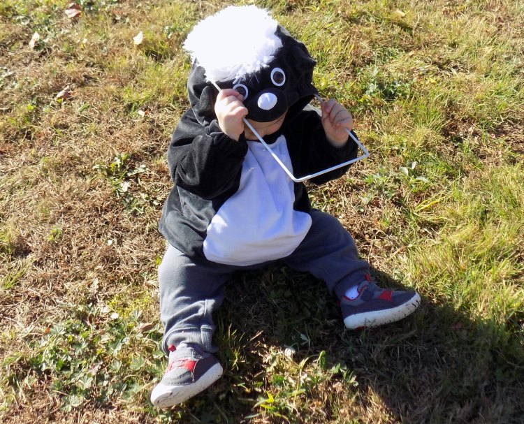 Chase Edwards, 17-months of Jay came as a skunk. Several times he removed the hood from the costume, then found a U-shaped metal stake in the field that he thought would make a good head covering. Finding just the right way to wear it was a challenge and family members were cautious that he didn’t poke himself with one of the ends.