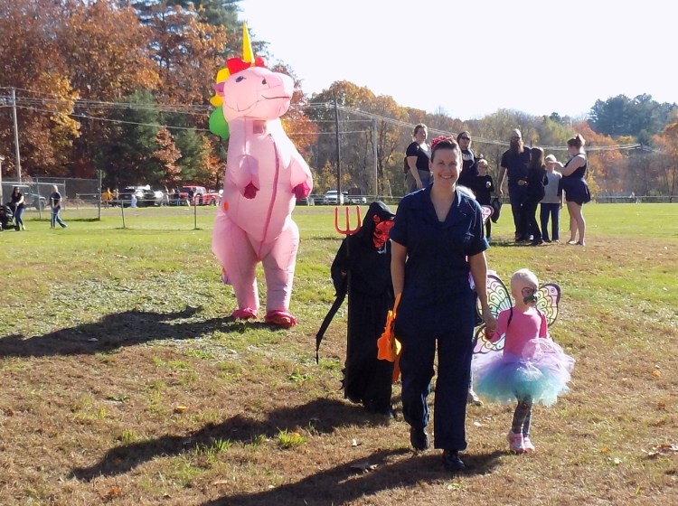 Ben Nawfel dressed as a giant pink unicorn caught the eye Saturday morning, Oct. 28, during the Kids Halloween Boo Bash at French Falls Park in Jay. Also seen from left are Patrick Nawfel, Danielle Nawfel and Evelyn Nawfel. Pam Harnden/Livermore Falls Advertiser