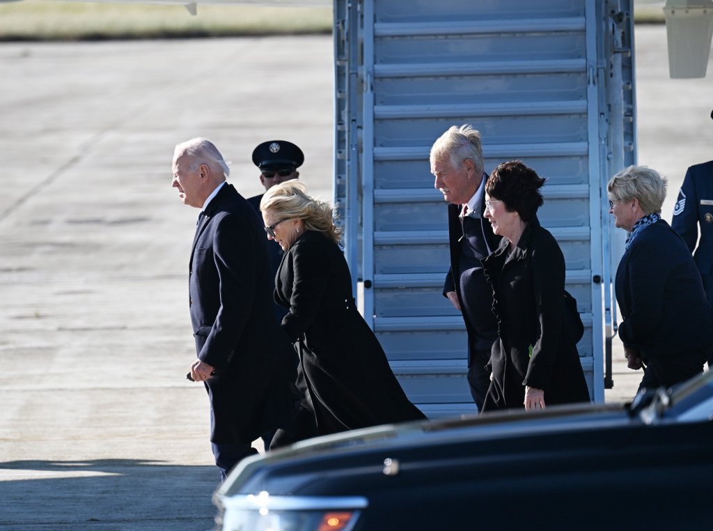 Wearing a black coat and aviator sunglasses, Biden landed at Joint Base Andrews in Maryland at a little after 1 p.m. to board Air Force One and depart for Maine, where he will meet with first responders, frontline workers and victims of last week’s mass shooting that killed 18 people and wounded 13 more in Lewiston. It was the deadliest shooting in Maine history and worse mass shooting in this country this year.