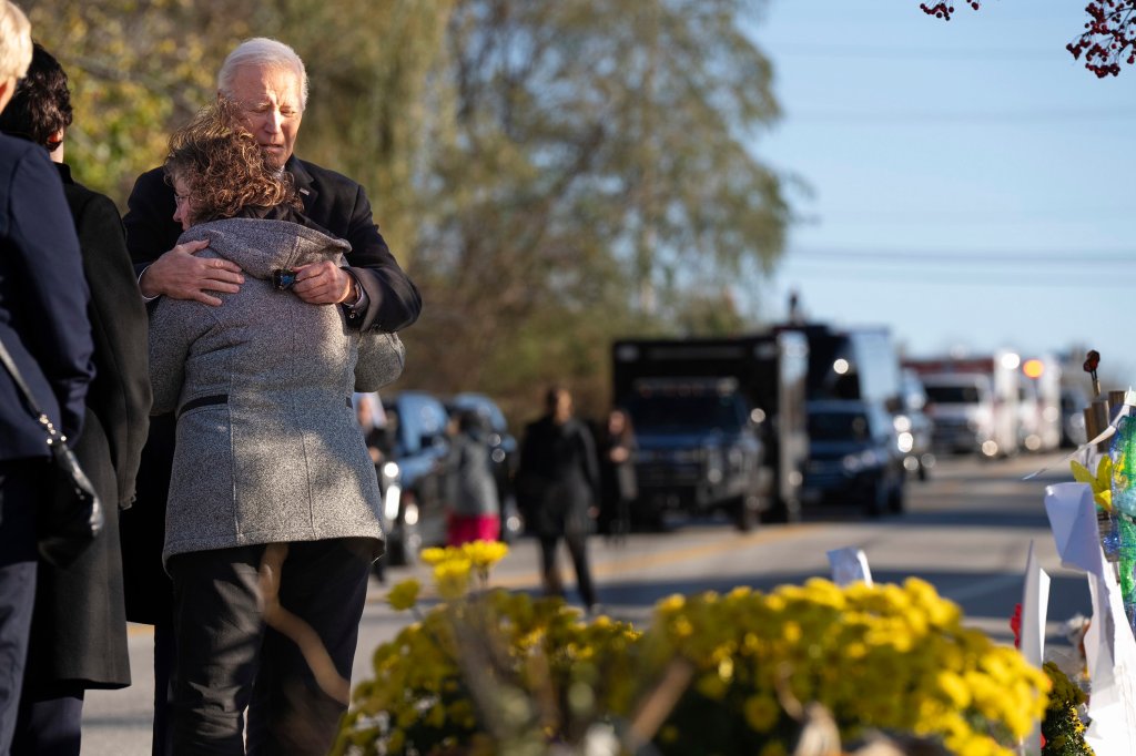 “Jill and I are here on behalf of the American people, to grieve with you and to make sure you know you’re not alone,” the president told those gathered outside the bowling alley.