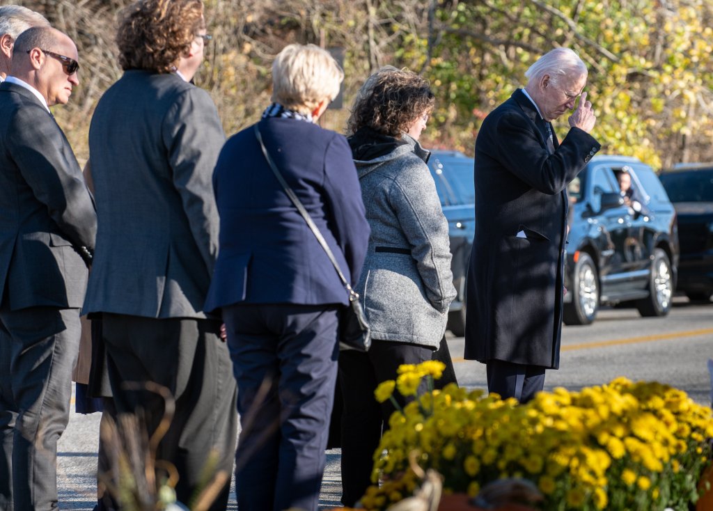 The Bidens brought a bouquet of flowers to a memorial site outside the bar and bowed their heads at the tribute of pumpkins and yellow chrysanthemums framed by other signs, such as “Lewiston Love Still Lives Here” and a red valentine-shaped heart.