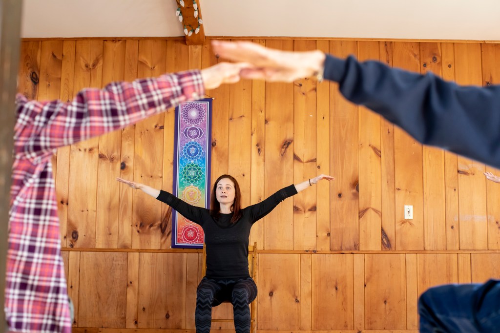 Lauren Wallin teaches a pay-as-you-go Chair Pilates class in Bethel Methodist Church. Rose Lincoln/Bethel Citizen