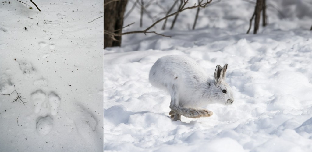 A simple starting point is learning to determine the direction the animal was moving. Below are the tracks of a snowshoe hare. We can tell that the hare who made this track was moving away from us for two reasons. The first is that the print is wider at the toes than the heal. The second is that when hares hop, their larger back feet land in front of their smaller front feet. In the resting position, they’ll leave a track with the back feet behind the front feet.