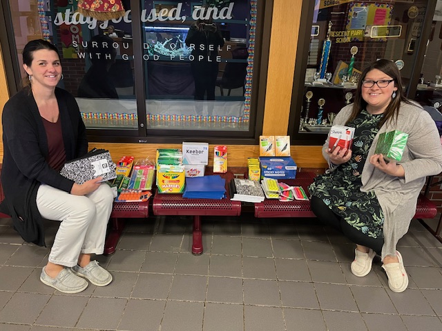 Rotary recently provided needed school supplies to three SAD 44 schools: Woodstock and Crescent Park Elementary Schools, and Telstar Middle Schools. Pictured here are CPS teachers Erin Deprey and Crystal Gould Submitted