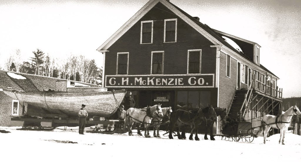 Four Horse team and a one horse “pung” in front of Mackenzie’s store in Oquossoc.
