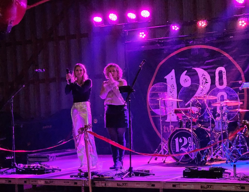 Event organizers Meredith Bickford-Thurston, at left, and Becky Curtis address the crowd at the second annual Mingle & Jingle fundraiser to benefit the Dempsey Center. Submitted photo