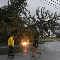 Lewiston man saws and pries apart a large root ball from a tree toppled by last month's storm.