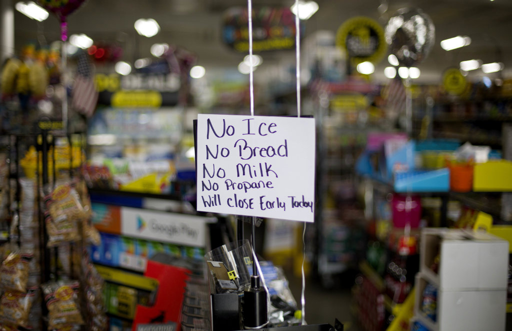 A message greets shoppers of supplies no longer available as Hurricane Florence approaches the east coast in Nichols, S.C., Thursday, Sept. 13, 2018. The residents of this tiny inland town who rebuilt after Hurricane Matthew destroyed 90 percent of the homes are uneasy as forecasters warn inland flooding from Florence's rain could be one of the most dangerous and devastating parts of the storm. (AP Photo/David Goldman)