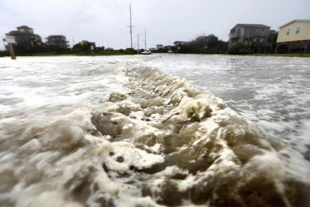 Ocean waters rushes down Hwy 12 in Frisco, N.C., on Hatteras Island as the effects of Hurricane Florence breach the dune line on Thursday, Sept. 13, 2018. (Steve Earley /The Virginian-Pilot via AP)